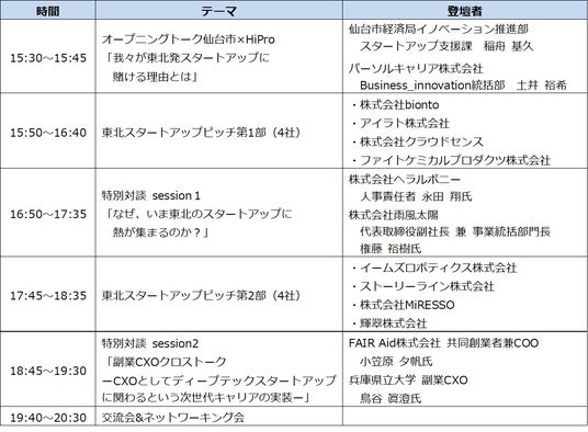 本イベントでは、人材を募集するスタートアップ8社が登壇し、自社の事業内容や経営課題、今後のビジョンを発信します。さらに、研究開発型スタートアップ※に副業として経営参画した人材によるキャリアストーリーの紹介、岩手県に本社を置く株式会社ヘラルボニーと株式会社雨風太陽による特別対談などを通じて、東北スタートアップの魅力や、スキルを地域で活かす新しい選択肢を伝え、実際の出会いにつなげる1日を創出します。