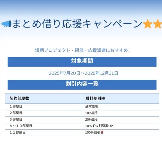 本キャンペーンでは、短期プロジェクトや研修、応援派遣など、複数名の滞在が必要な法人様・個人様を対象に、部屋数に応じて賃料が最大で100%割引となる特典をご用意しています。