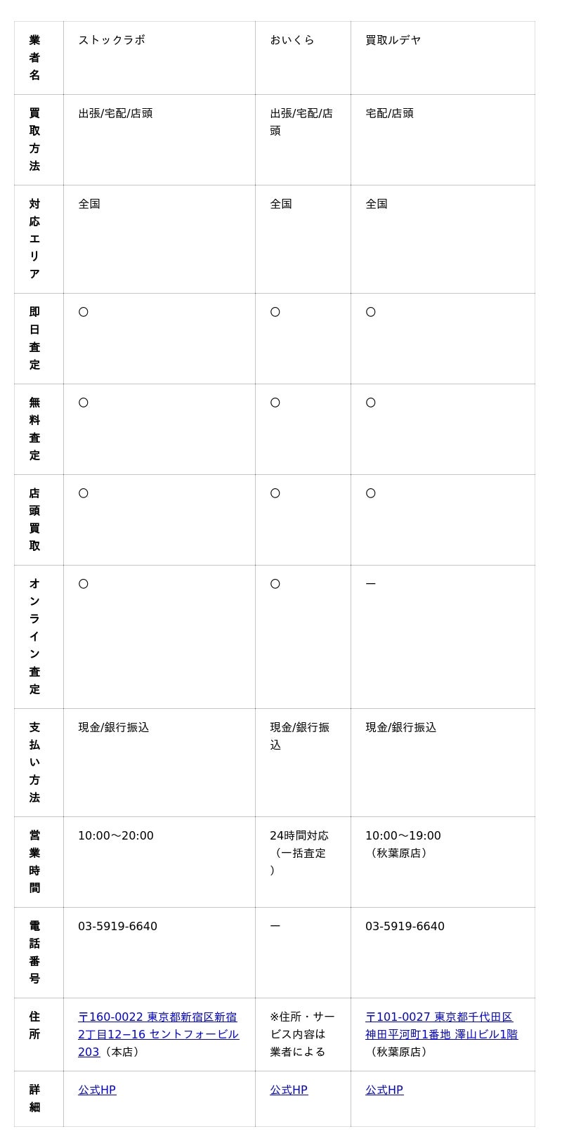 移転前の新大久保店時より何度か利用しています。秋葉原に移転してから店内が丸見えです。買い取り金額等はHP通りです。 買い取り予約確定後は金額変わりません 箱などに問題が無ければ満額です。 減価された事はありません 悪い評価がありますがシステムを理解出来て無いのでは? 2023年7月に再訪しましたが、ガラスにシートが貼られて外から丸見えでは無くなりました。
