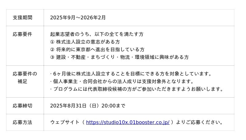 東京都協定事業「多様な主体によるスタートアップ支援展開事業」に採択された株式会社ゼロワンブースター(本社:東京都千代田区、代表取締役:合田ジョージ)は、建設・不動産・まちづくり・物流・環境領域に興味を持つ起業志望者に対してスタートアップ創出プログラム「STUDIO 10X」を提供しています。「STUDIO 10X」は企業に眠る機会を最大限に活用し、建設・不動産・まちづくり・物流・環境領域において新たなスタートアップの創出を目指す6ヶ月間の集中支援プログラムです。この度、栗田工業株式会社、株式会社MOL PLUS(株式会社商船三井を母体に持つCVC)が、新たにパートナー企業として参画し、パートナー企業が合計8社となりました。それに伴い、第3期の応募締切を2025年8月31日(日)まで延長します。なお、第3期の支援は、2025年9月~2026年2月までの期間で実施します。