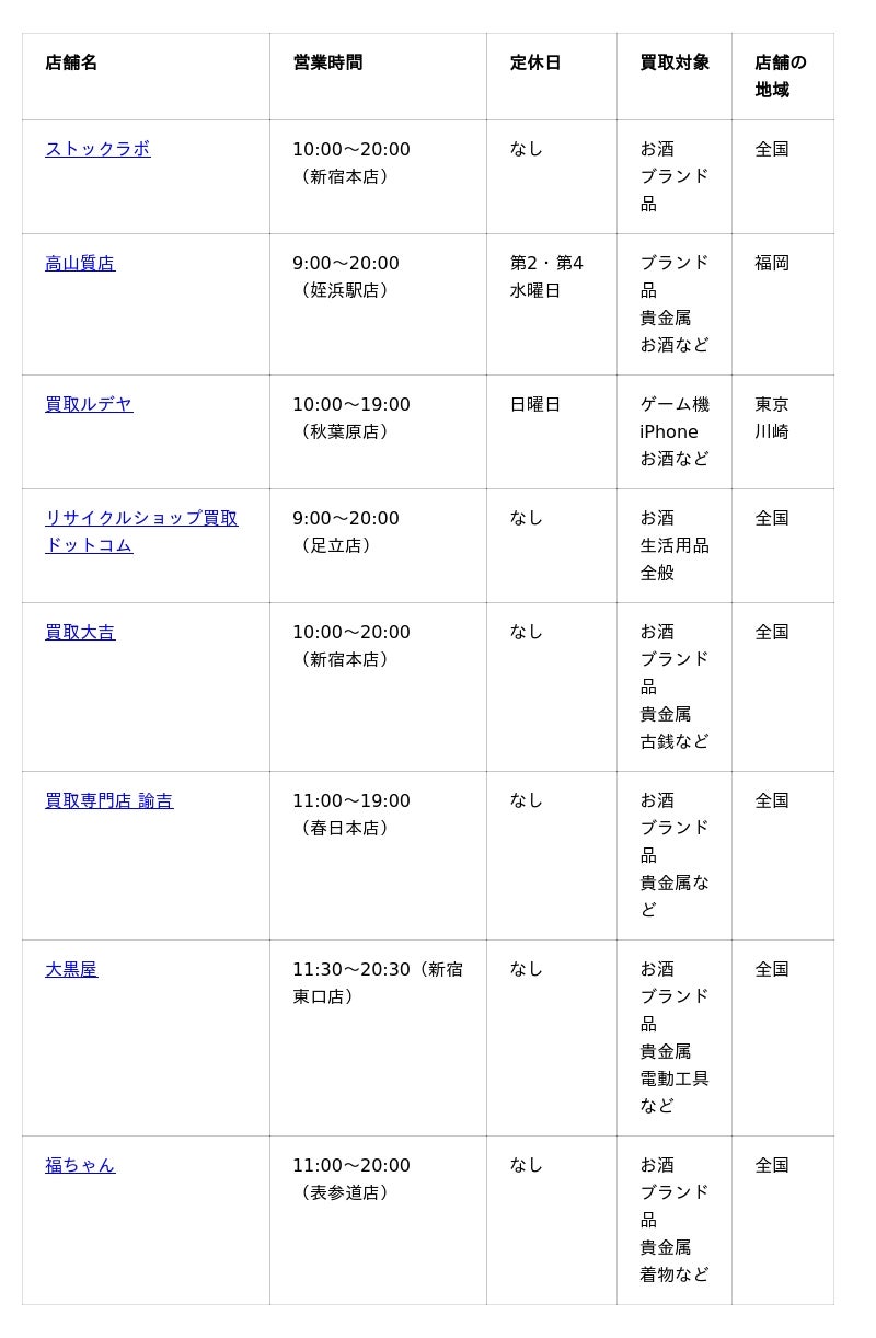 では、白州買取におすすめの業者を8選ご紹介します。まずは、今回紹介する業者と主な情報をまとめた一覧表からご覧ください。
