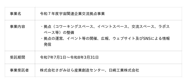 株式会社さがみはら産業創造センター(本社:相模原市緑区、代表取締役:山崎 利宏」)は、日崎工業株式会社(本社:川崎市川崎区、代表取締役:三瓶 修)と共に、今後、成長が見込まれる宇宙関連産業のクラスター形成強化を図る「宇宙関連企業交流拠点事業」を受託しましたのでお知らせします。