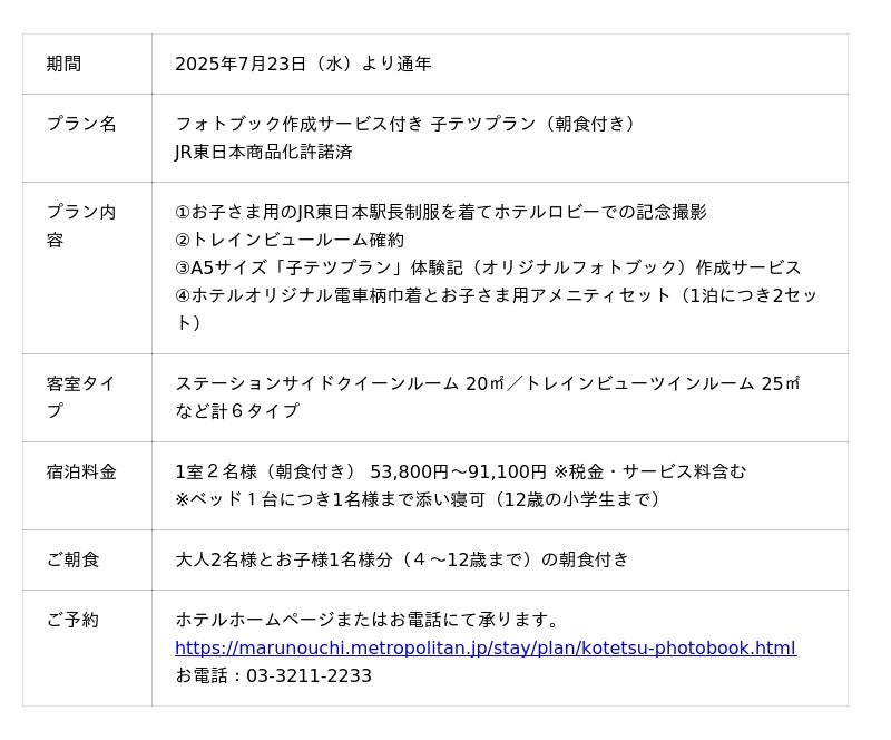 光村印刷株式会社の提供するオリジナルフォトアイテム作成サービス「日々レコ(R)」をホテルとして初導入し、宿泊プラン「子テツプラン」をリニューアルいたします。従来のJR東日本駅長制服を着用しての記念撮影やトレインビュールームの確約に加えて、ご旅行中に撮影した写真をスマートフォンやパソコンからオンライン上で登録するだけで、フォトブックが手軽に作れるサービスが付いた、新しいプランに生まれ変わりました。かけがえのない思い出を手に取ることのできる“カタチ”として残し、ページをめくるたびにあたたかな旅の記憶や余韻がいつまでも続く宿泊体験をお楽しみください。