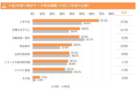 - 危機感の高まり:今後3年間で自社が検討すべき物流課題の有無を尋ねたところ、「ある」と回答した企業は87.2%にのぼり、3年前(79.8%)から7.4ポイント上昇しました。
