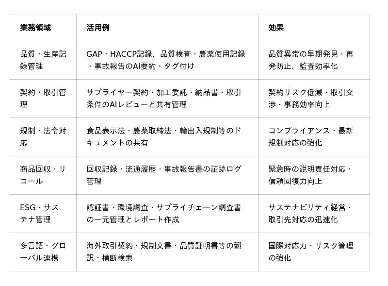 農業・食品分野では、GAPやHACCPなどの認証対応、膨大な生産記録・品質検査データ、農薬・添加物規制への対応、サプライヤー・小売との契約管理、商品回収(リコール)・事故時の証跡管理、国際取引に伴う多言語文書のやり取り、ESG・サステナビリティ情報の管理など、現場と本社を結ぶ文書業務が年々増加・複雑化しています。本ソリューションは、AIとVDRの力で現場から経営までのデータ・文書管理、リスク管理、法規遵守を強力にサポートします。