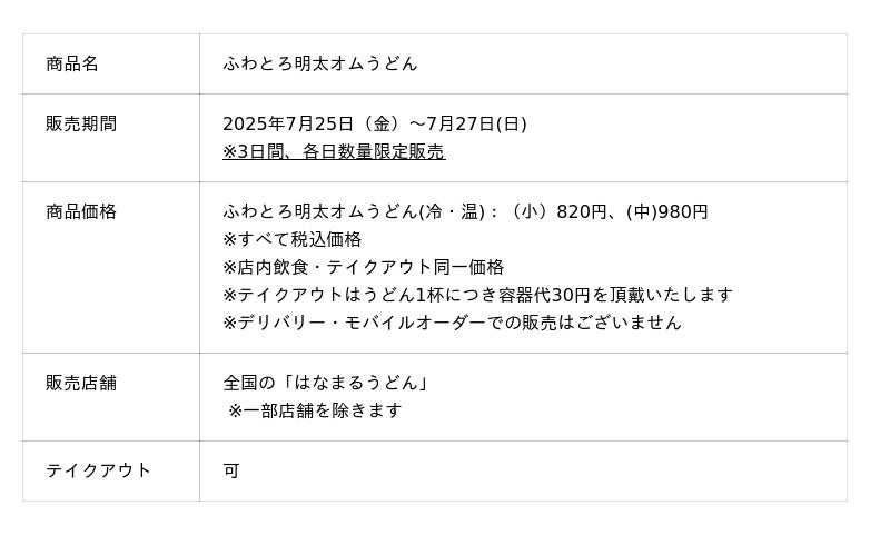 讃岐うどんチェーン「はなまるうどん」を展開する株式会社はなまる(本社:香川県高松市、代表取締役社長:前田良博)は、地元・香川の声から生まれた新メニュー「ふわとろ明太オムうどん」を、2025年7月25日(金)から7月27日(日)までの3日間、全国のはなまるうどん(※一部店舗除く)にて各日数量限定で販売いたします。本商品は、讃岐うどんの魅力発信を目的とした「おいでまい!さぬきプロジェクト」の一環として開発されました。