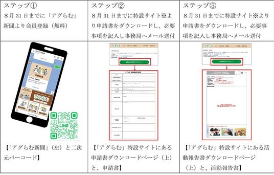 申請は、LINE基盤の情報媒体である「アグらむ新聞」にて会員登録(無料)のうえ、特設サイトにある申請書に必要事項を記入し、事務局にメールいただくことで完了します。活動終了後には報告書の提出も必要です。なお、優れた活動は「アグらむアワード」として表彰し、日本農業新聞紙面などで、活動内容を紹介します。