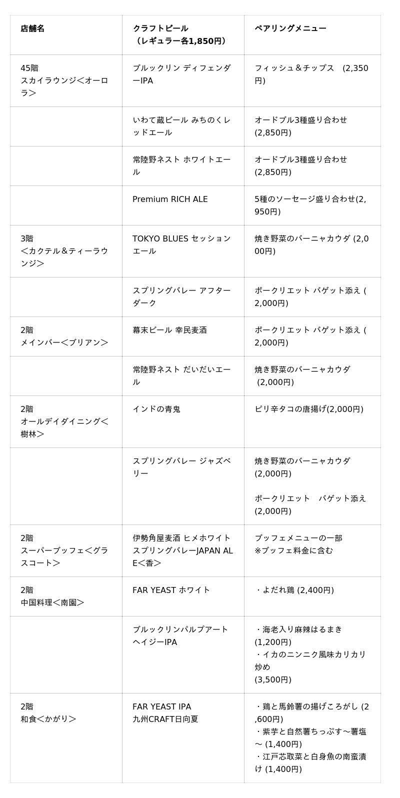 「ここでしか飲めないカクテル」をテーマに、メインバー<ブリアン>、スカイラウンジ<オーロラ>ではホテル自慢のバーテンダーによるビールカクテルを、<カクテル&ティーラウンジ>、アートラウンジ<デュエット>ではフルーツビールを提供します。