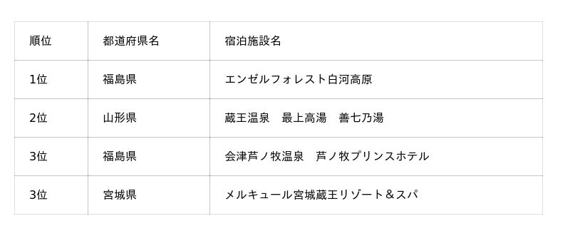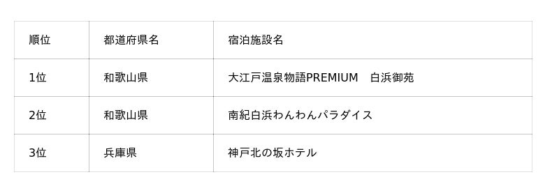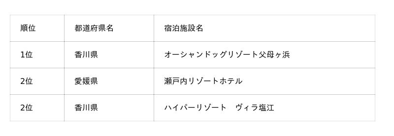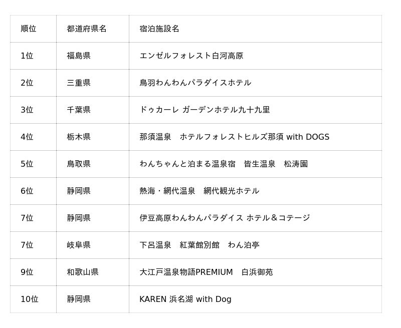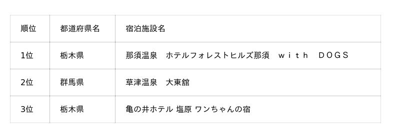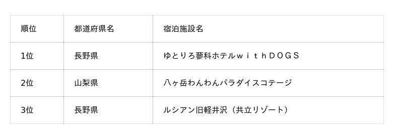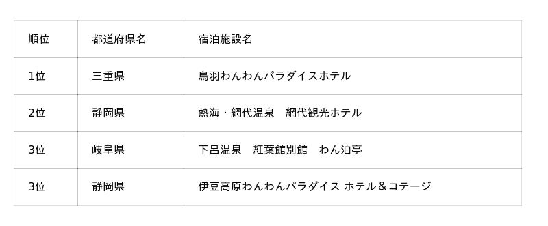 そのほか、今回新たに上位にランクインした施設もあり、四国エリアでは初登場ながら1位となった「オーシャンドッグリゾート父母ヶ浜」、北関東エリアでは「亀の井ホテル塩原 わんちゃんの宿」が3位に入りました。「亀の井ホテル塩原 わんちゃんの宿」は、2025年2月1日に“わんちゃんと泊まれる宿”としてリニューアルしたばかりにもかかわらずランクインしており、注目施設といえるでしょう。