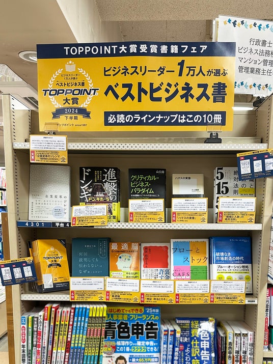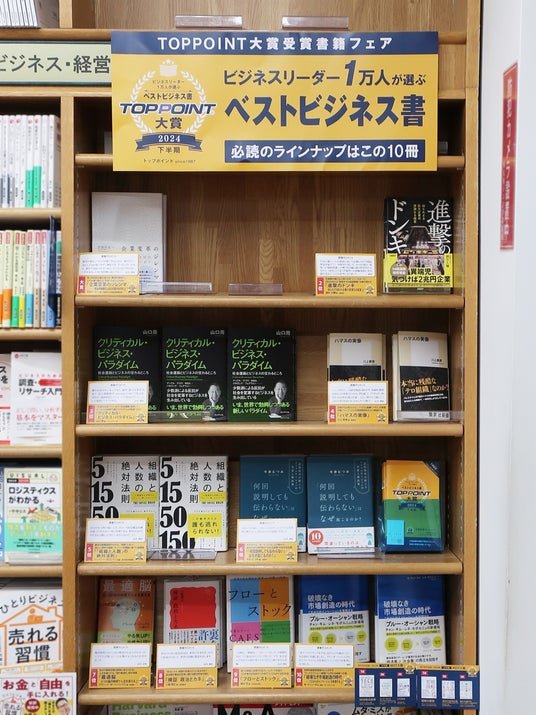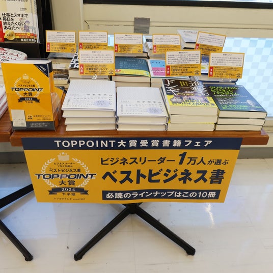 本賞の決定に伴い、丸善ジュンク堂書店・文教堂・未来屋書店の主要大型店約50店舗にて「TOPPOINT大賞受賞書籍フェア」を開催します。フェアでは、ベスト10冊に選ばれた各書籍を、その書籍の読みどころや読者のコメントを記したPOPと並べて展開。また、本賞の概要を紹介した小冊子(無料)も配布します。開催期間は、8月1日(金)より1カ月間の予定です。