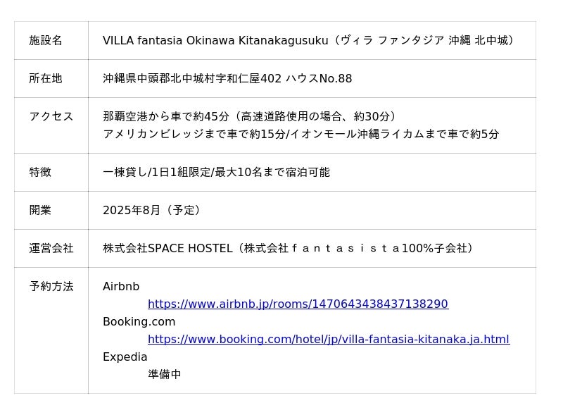 ブランド名には【VILLA fantasia】と【CASA fantasia】を掲げ、今回の沖縄を手始めに観光需要の見込めるエリアでの展開を予定しております。また、物件の開発には当社グループ所有不動産のほか、長期間使われていない空き家等を積極的に活用し、地域文化・自然との調和を重視した空間づくりを通じて、観光振興と地域の活性化に貢献してまいります。