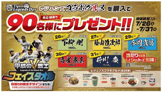 阪神電気鉄道株式会社(本社:大阪市福島区、社長:久須勇介)が運営する阪神甲子園球場は、7月26日(土)対横浜DeNAベイスターズ戦~31日(木)対広島東洋カープ戦において、阪神甲子園球場内売店・ワゴンで「タイガース レジェンズコラボグルメ」をご購入いただいた方の中から各日抽選で90名様(期間合計450名様)に、“平成のV戦士”である下柳剛氏、桧山進次郎氏、今岡真訪氏、赤星憲広氏、井川慶氏の「“平成のV戦士”フェイスタオル」をプレゼントするキャンペーンを開催します!