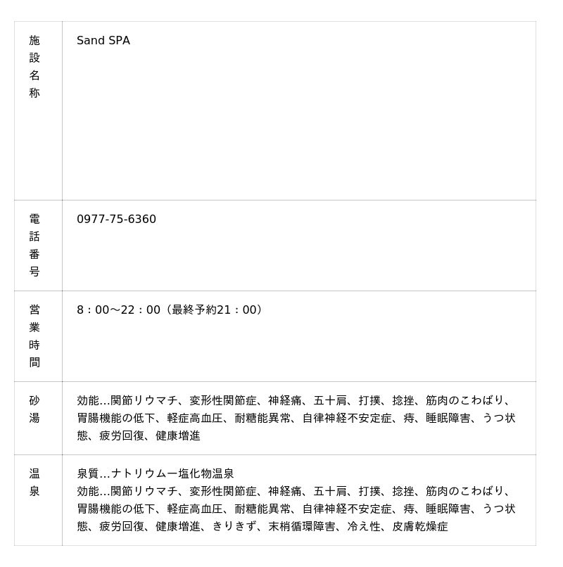 「Sand SPA」は、別府湾を一望できる開放感あふれるロケーションの中、心身ともに癒される温浴体験をご提供いたします。最大48名まで同時に利用可能な砂湯では、海風や波の音を感じながら心身をじっくりと温める特別な時間をお過ごしいただけます。砂湯をご利用いただいた後は、源泉かけ流しの大浴場で、別府温泉の魅力をご堪能いただけます。館内にはバーカウンターもあり、乾いた喉を潤しながら湯上がりのひとときをゆったりとお楽しみいただけます。