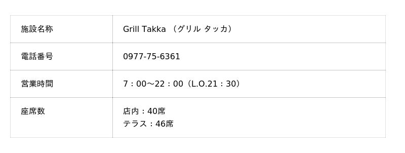 「Grill Takka」では、大分・別府の豊かな食材を活かしたグリル料理 を中心に、土地の恵みを味わえる料理をご提供いたします。朝食・ランチ・ディナーと全時間帯営業しており、ご宿泊のお客様に限らず、どなたでもご利用いただけます。レストラン内には開放感あふれるテラス席や、落ち着いた雰囲気の半個室も備えており、カジュアルなご利用からプライベートな会食まで、さまざまなシーンに対応いたします。