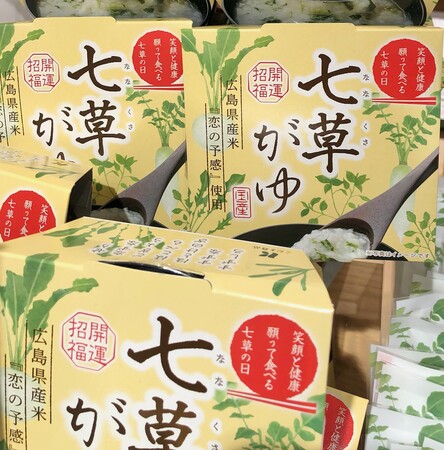 その年の無病息災を願って、正月七日の朝に7種類の野草(セリ、ナズナ、ゴギョウ、ハコベラ、ホトケノザ、スズナ、スズシロ)をかゆに入れて食べる「七草がゆ」の行事は、江戸時代に歳時記として定着し、ご家庭でも手軽に楽しんでいただけるようになったのは、1985年に当店の当時の販促担当者と野菜売場の担当者、京都の植物学者が野に出て七草を摘みパック詰めをし、約1,000パックを売り出したのがきっかけと言われています。