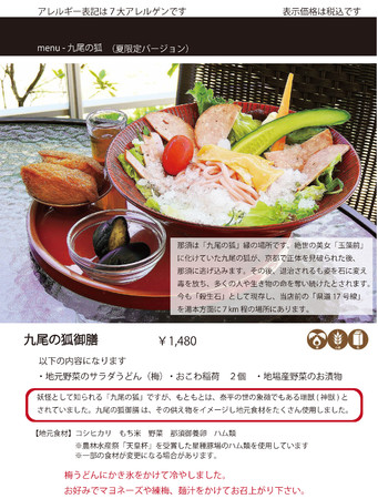 株式会社コールラビが運営する飲食店「那須高原バル」(栃木県那須町)の事業長 平山みゆき(取締役)は、同店にて、2022年7月16日(土)より九尾の狐御膳(夏バージョン)の販売を開始します。