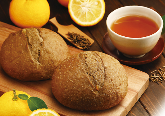 京都府産ほうじ茶の粉末と柚子ピールを練り込み、石窯で焼き上げました。