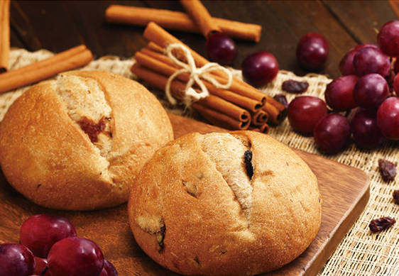 シナモンと洋酒漬けカリフォルニア産レーズンを練り込み、石窯で焼き上げました。