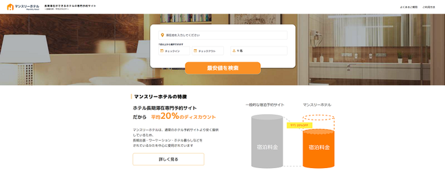 Monthly Hotelは、新型コロナウイルス感染拡大の影響により、宿泊需要も大幅に減少したことを受け、宿泊施設の稼働率の安定の一助となることを目指し2020年11月よりサービスの提供を開始しました。長期宿泊専門の予約サイトとして全国約650と豊富なホテル掲載数を誇ります。