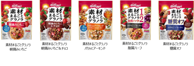 日本ケロッグ60周年の集大成製品として新発売する「ケロッグ素材まるごとグラノラ」は、これまで培ってきた知見や開発技術を活かし、素材一つ一つの良さを最大限に活かしたグラノラです。「“おいしさ”まるごと」「“栄養”まるごと」「“自然”まるごと」の3つの「まるごと」をコンセプトに、素材そのものの味や食感を楽しめるように改良を重ね作り上げました。