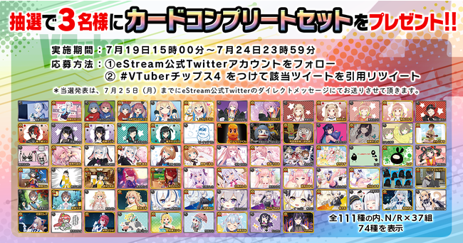 株式会社CyberZ(本社:東京都渋谷区、代表取締役社長:山内隆裕)の連結子会社、株式会社eStream(本社:東京都渋谷区、代表取締役社長:高井里菜)は、人気バーチャルYouTuber(以下、VTuber)全37組111種類のオリジナルカードが付いた「VTuberチップス4」を7月26日(火)より順次発売することが決定いたしました。