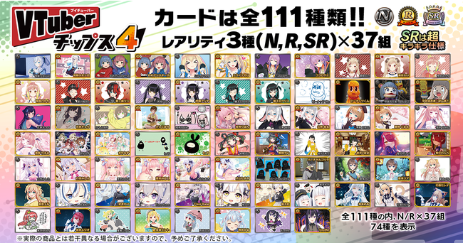 人気VTuber全37組がカード化された本商品には、ネタ(N)カード37種、レア(R)カード37種、スーパーレア(SR)カード37種の全111種類のうち、ランダムでカードが1枚付いてきます。