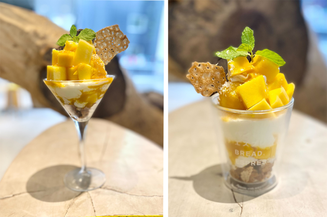 アップルマンゴーを丸ごとトッピング。自家製クラム、杏仁豆腐、マンゴーシャーベット、マスカルポーネクリームを詰め込んだ、アップルマンゴーの美味しさを存分に味わえる贅沢なパフェ。