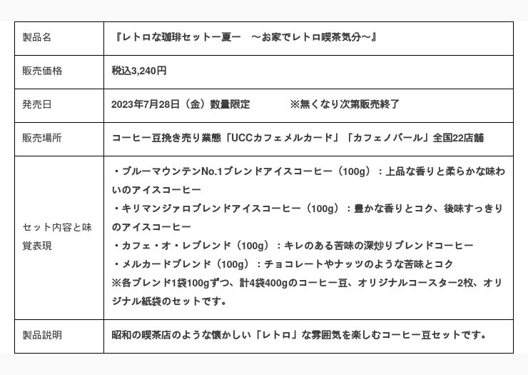 UCC上島珈琲株式会社(本社/兵庫県神戸市、資本金/10億円、社長/朝田文彦、以下UCC)は、UCCが直営で展開するコーヒー豆挽き売り業態「UCCカフェメルカード」「カフェノバール」22店舗にて、昭和の喫茶店のような「レトロ」な雰囲気をお届けするコーヒー豆セットの第2弾として、『レトロな珈琲セットー夏ー ~お家でレトロ喫茶気分~』を7月28日(金)に新発売します。あわせて店舗併設の喫茶コーナーでは、「夏のニューレトロな純喫茶メニュー」として、昔ながらの懐かしいおいしさを感じられる 喫茶店の定番メニュー「プリン」「レモネード」、懐かしさに加えて新しさを感じられる「マンゴーパッションのオペラ」「コーヒーレモネード」をご提供しています。