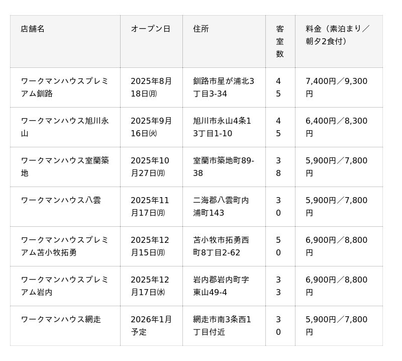 北海道を中心に工事事業者支援事業などを展開するレッドホーストラスト株式会社(本社:北海道札幌市中央区、代表取締役:八重樫 暁)は、北海道の釧路市・旭川市・室蘭市・八雲町・岩内町・苫小牧市・網走市に、出張に特化した食事付きビジネス宿泊施設「ワークマンハウス」を2025年度計7店舗新規オープンいたします。既存22店舗に加え、道内での展開は合計29店舗となる予定です。
