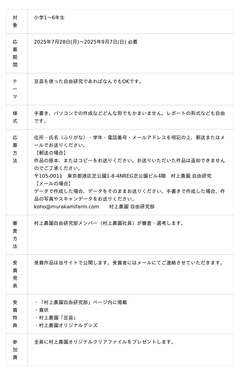 「豆苗の自由研究コンテスト」は、豆苗に関するテーマであれば栽培実験、調査、レシピ開発、工作など形式は自由です。子どもたちの発見やアイディアを形にして、ぜひご応募ください。村上農園の従業員が厳正に審査を行い、受賞作品は9月下旬以降に特設サイト『村上農園 自由研究部』で発表いたします。