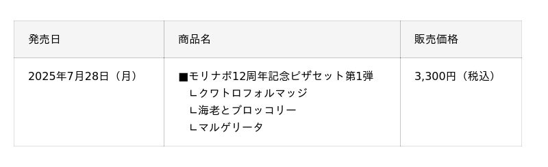 石川県金沢市にて冷凍ピザの製造・販売を行う株式会社森山ナポリは、2025年8月28日(木)に12周年を迎えます。お客様へ日頃のご愛顧に感謝をし、2025年7月28日(月)~8月8日(金)までの期間、人気商品を集めた「モリナポ12周年記念ピザセット第1弾」を特別価格にてご提供いたします。また、12周年を機に、ブランド名を「森山ナポリ」から「モリナポ」へと変更いたします。