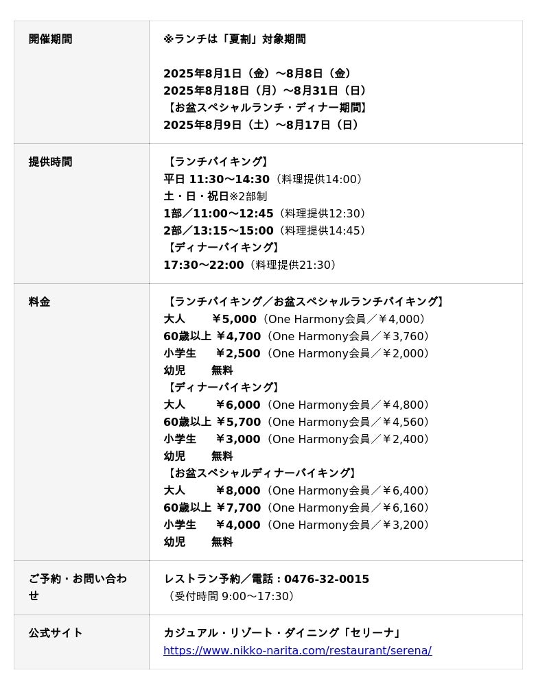 ホテル日航成田(所在地:千葉県成田市、総支配人 山田 篤)では、2025年8月1日(金)~8月31日(日)の期間、カジュアル・リゾート・ダイニング「セリーナ」にて『ファミリーバイキング』を開催します。