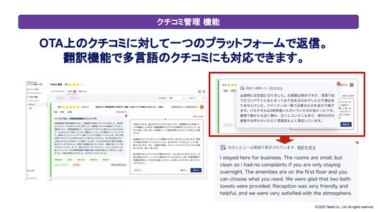宿泊・観光産業のDX(デジタルトランスフォーメーション)を推進するTabist株式会社(本社:東京都港区、代表取締役社長 兼 CEO:田野崎亮太、以下「Tabist」)は、宿泊施設に寄せられるゲストの声への対応を大幅に効率化する「Tabistレビュー管理」を新たに開発し、提供を開始しました。「Tabistレビュー管理」では、AI(人工知能)技術を活用した自動返信機能と複数プラットフォームにまたがる評価の分析機能を提供し、現場の業務負担を軽減するとともに、レビュー傾向の可視化を通じて施設運営の継続的な改善を支援します。