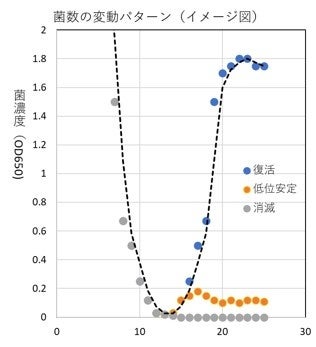 1つ目は、菌数の減少から、再度復活して大きく増殖し繁栄を遂げるパターン。