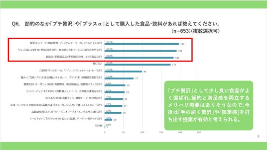 「プチ贅沢」として少し良い食品がよく選ばれ、節約と満足感を両立するメリハリ需要はありそうなので、今後は「手の届く贅沢」や「限定感」を打ち出す提案が有効と考えられる。