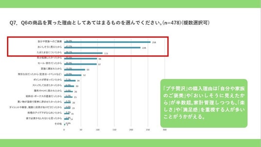 「プチ贅沢」の購入理由は「自分や家族のご褒美」や「おいしそうに見えたから」が半数超。家計管理しつつ「楽しさ」や「満足感」を重視する人が多いことがうかがえる。