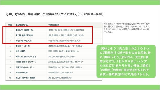 上位3項目に着目。※上記表はAIを活用して569件の自由記述定性データから「売り場を選択した理由」の上位傾向を内容的に括り、定量化を試みた場合、10項目が主な選択理由として挙げられる。