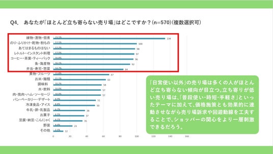 「日常使い以外」の売り場は多くの人がほとんど立ち寄らない傾向が目立つ。立ち寄りが低い売り場は「普段使い・時短・手軽さ」といったテーマに加えて、価格施策とも効果的に連動させながら売り場訴求や回遊道線を工夫することで、ショッパーの関心をより一層刺激できるだろう。