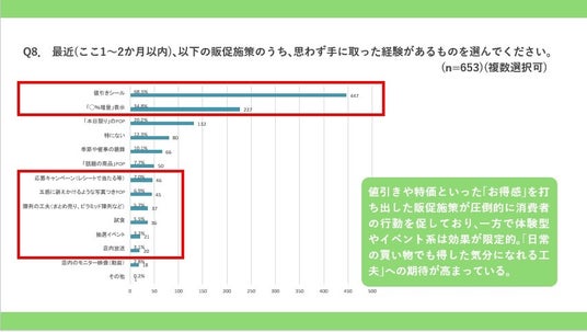 値引きや特価といった「お得感」を打ち出した販促施策が圧倒的に消費者の行動を促しており、一方で体験型やイベント系は効果が限定的。「日常の買い物でも得した気分になれる工夫」への期待が高まっている。