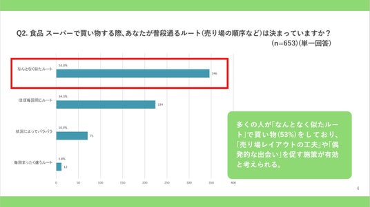多くの人が「なんとなく似たルート」で買い物(53%)をしており「売り場レイアウトの工夫」や「偶発的な出会い」を促す施策が有効と考えられる。
