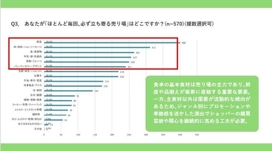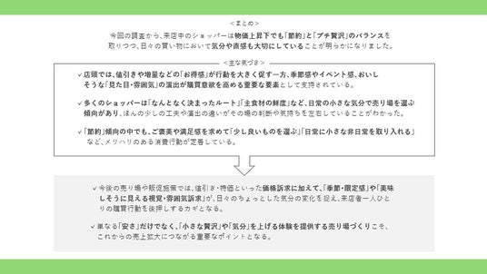 多くの節約志向のショッパーは「なんとなく決まったルート」「主食材の鮮度」など、日常の些細な気分で売り場を選ぶ傾向があり、ほんの少しの工夫や演出の違いがその場の判断や気持ちを左右していることがわかった。