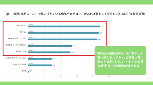 嗜好品や高級食材などは3割以上が買い控えられており、必需品以外の節約が進行。また、レトルトやお酒も2割前後で抑制傾向が見られる。
