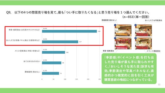 店頭では、値引きや増量などの「お得感」が行動を大きく促す一方、季節感やイベント感、おいしそうな「見た目・雰囲気」の演出が購買意欲を高める重要な要素として支持されている。