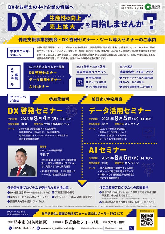 熊本市(市長:大西 一史)は、今年度で3年目となるデジタル技術を活用した業務変革等に取り組む市内の中小企業等を対象に、専門家による集中的な伴走支援等を行う「熊本市中小企業等DXアクセラレーション事業」を実施します。