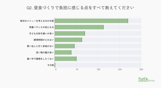 「Q2.Q1で「非常に感じる/やや感じる」と回答した方のみ質問します。昼食づくりで負担に感じる点をすべて教えてください。(複数選択可)」という質問に対し、結果は次のとおりとなりました。(n=379)