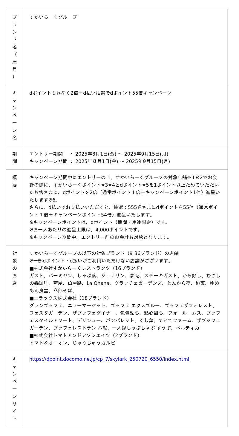 本キャンペーンへの参加にはエントリーが必要で、キャンペーンサイトからエントリーの上、すかいらーくグループの対象店舗※1※2でお会計の際に、すかいらーくポイント※3※4とdポイント※5を1ポイント以上ためたお客さまに、dポイントを2倍進呈いたします※6。さらに、「d払い(R)」でお支払いいただくと、抽選で555名さまにdポイントを55倍進呈いたします※6。詳細はキャンペーンサイトにてご確認ください。