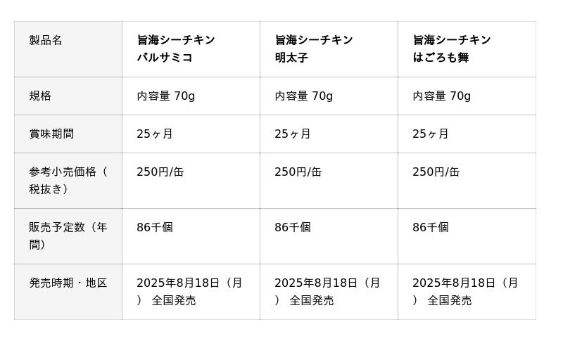 はごろもフーズ株式会社(本社:静岡県静岡市 社長:後藤佐恵子)は、『シーチキン』とツナが持つ旨みを最大限に引き出す食材を組み合わせて味にこだわった「旨海シーチキン」3種を発売します。