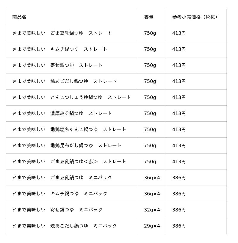 ごま豆乳鍋つゆ・キムチ鍋つゆ・焼あごだし鍋つゆ・寄せ鍋つゆ(ストレート・ミニパックともに)、とんこつしょうゆ鍋つゆ、濃厚みそ鍋つゆ