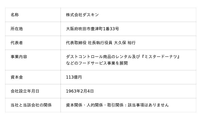 本提携により、両社のお互いの顧客に対し、それぞれ商品・サービスの提供を行うことや今後両社の顧客基盤、ノウハウ、ブランド等を活用した新サービスの展開に向けて、協業の検討をおこなってまいります。3. 株式会社ダスキンについて