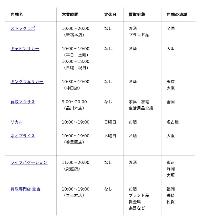 さっそく、ブッカーズの買取におすすめの業者を紹介しましょう。はじめに、各業者の主要情報をまとめた以下の一覧表から目を通してください。